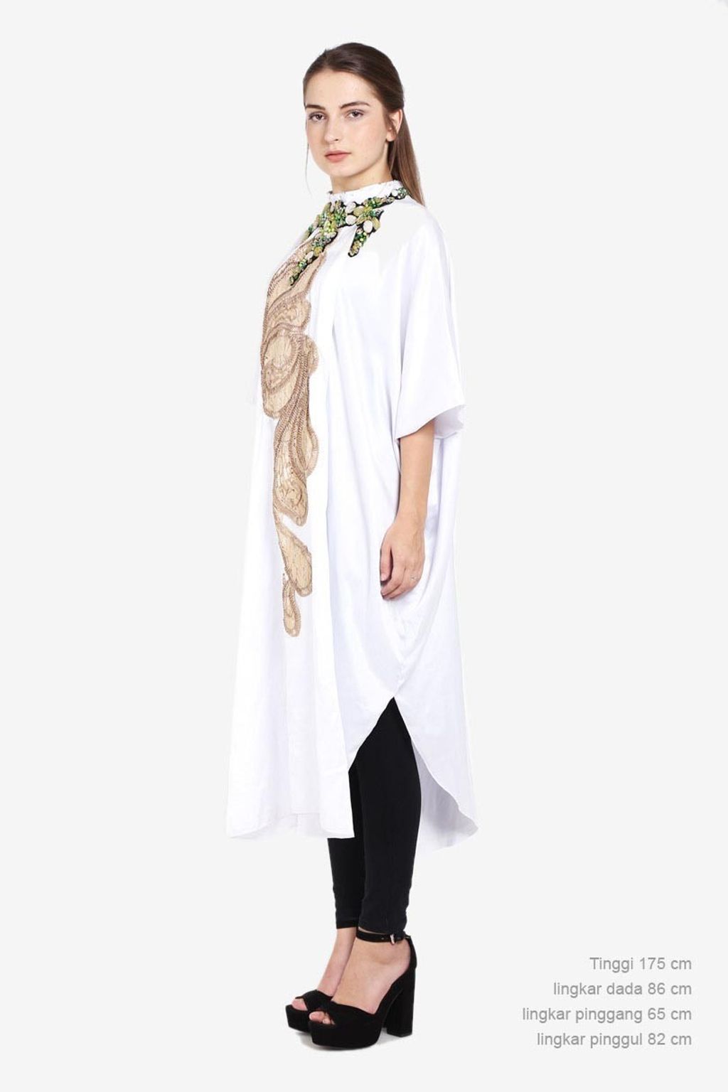 Lingkar dada 86 cm, lingkar pinggang 65 cm, lingkar pinggul 82 cm, tinggi 175 cm. Ukuran yang dikenakan model adalah free size.