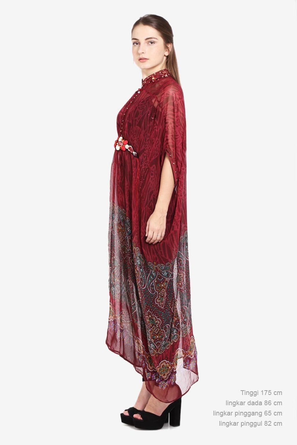 Lingkar dada 86 cm, lingkar pinggang 65 cm, lingkar pinggul 82 cm, tinggi 175 cm. Ukuran yang dikenakan model adalah free size.